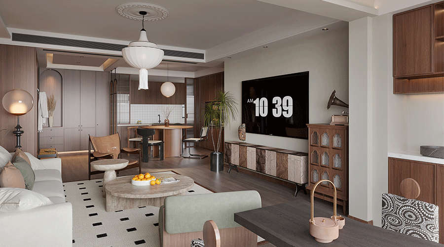 以純粹的形體拉開故事序幕,客餐廳不故作聲勢、不矯揉造作,以功能為主導(dǎo)編織空間故事。塊面的穿插、立體的線條豐富空間體態(tài),以結(jié)構(gòu)的骨感勾勒其體魄,溫潤的材質(zhì)與色調(diào)把控空間語氣,剛?cè)岵碌目臻g故事展開一幕待人緩緩而入的松弛與雅致。